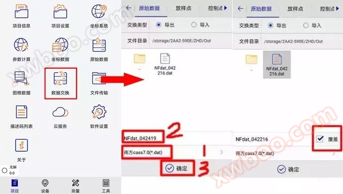 主页面【项目】→【数据交换】→勾选【导出】→输入文件名并选择文件格式→点击【确定】,根据情况,可勾选覆盖选项。